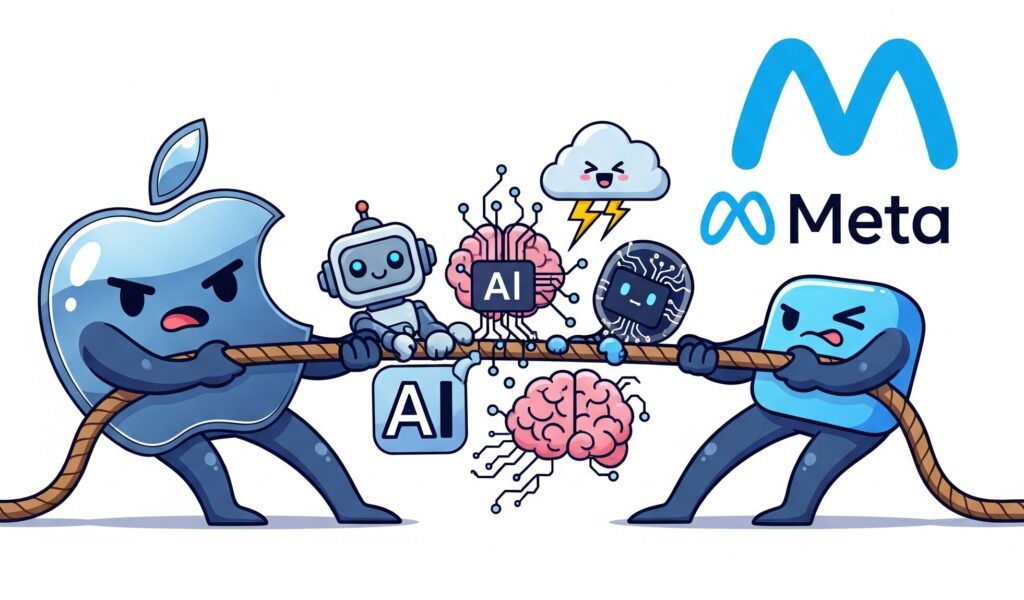 Fig. 1: An illustration depicting the tug-of-war for AI talent between Apple and Meta. (Image created by Gemini AI)
